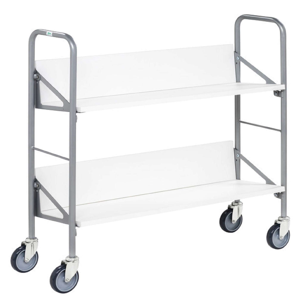 Carrello per biblioteca con 2 ripiani inclinati in melamina di betulla. Telaio grigio con rivestimento a polvere. Il carrello per biblioteca è facile da manovrare e può essere spinto facilmente da entrambi i lati. Viene fornito con 4 fermalibri.