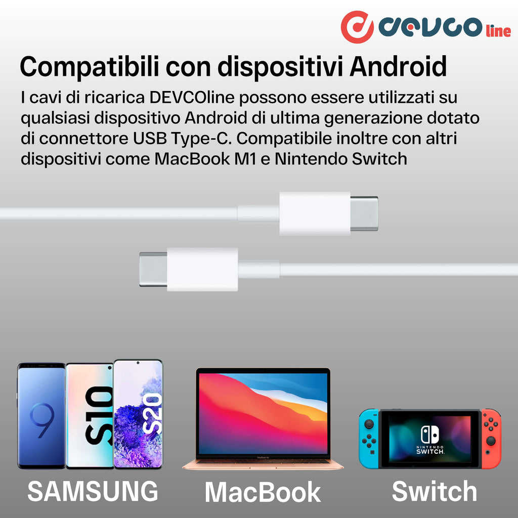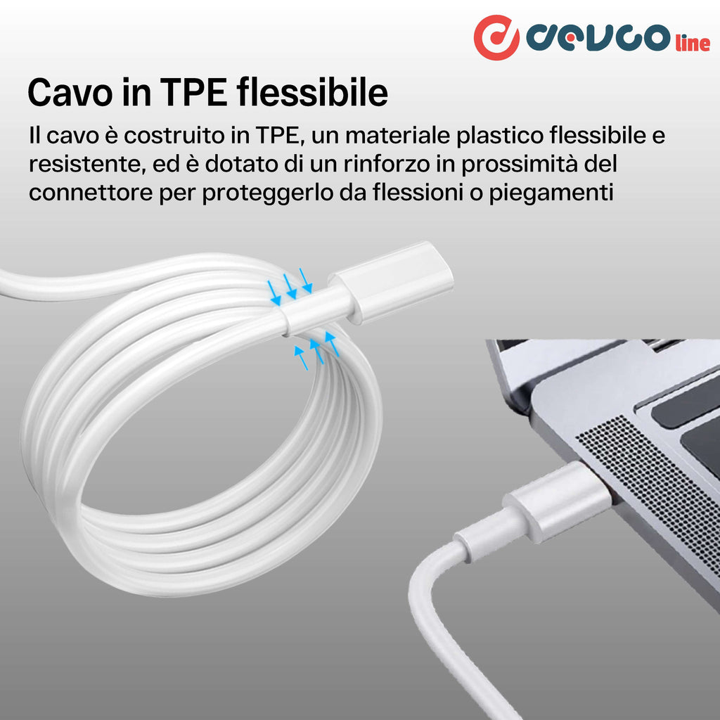 Il cavo USB-C, è compatibile con qualsiasi dispositivo fornito di USB TypeC , permettendo così di avere un'ampia area di compatibilità tra cui anche il nostro alimentatore con connettore USB-C